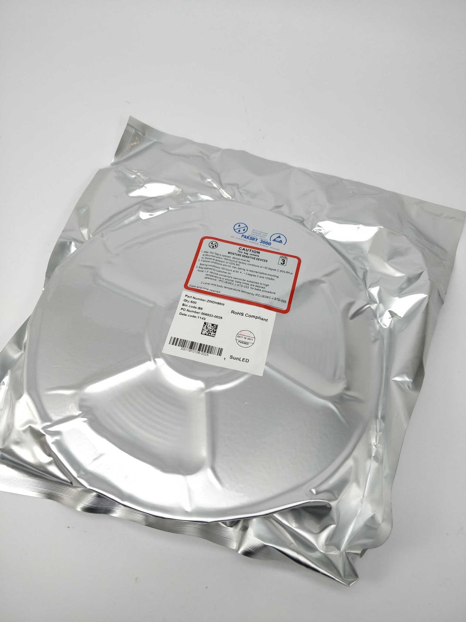 Original pakage/Wheel. 500Pcs pr.Reel Bin Code: B8 PO Number 006822-0025 Data Code 1143 Reddish-Orange
