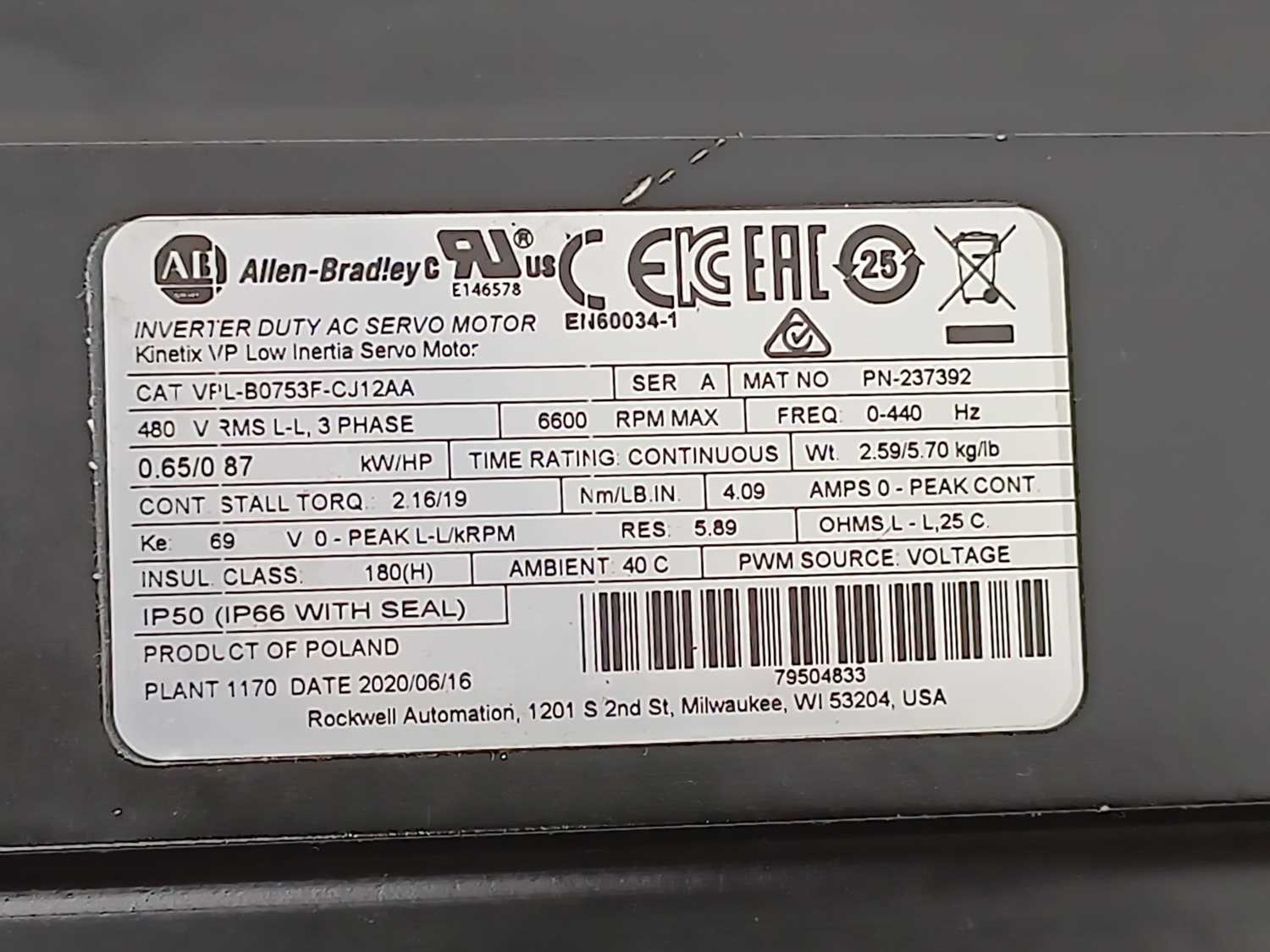 AB VPL-B0753F-CJ12AA Ser. A KINETIX VP Low Inertia Servo Motor