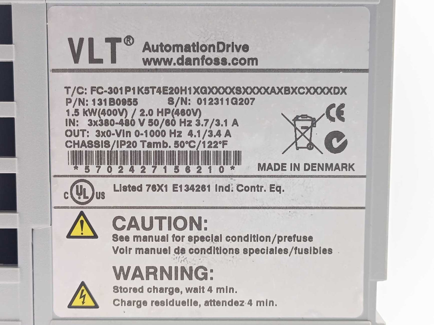 IN: 3x380-480V 50/60Hz 3.7/3.1A OUT: 3x0-Vin 0-1000Hz 4.1/3.4A Has scratches. Refer to photos.