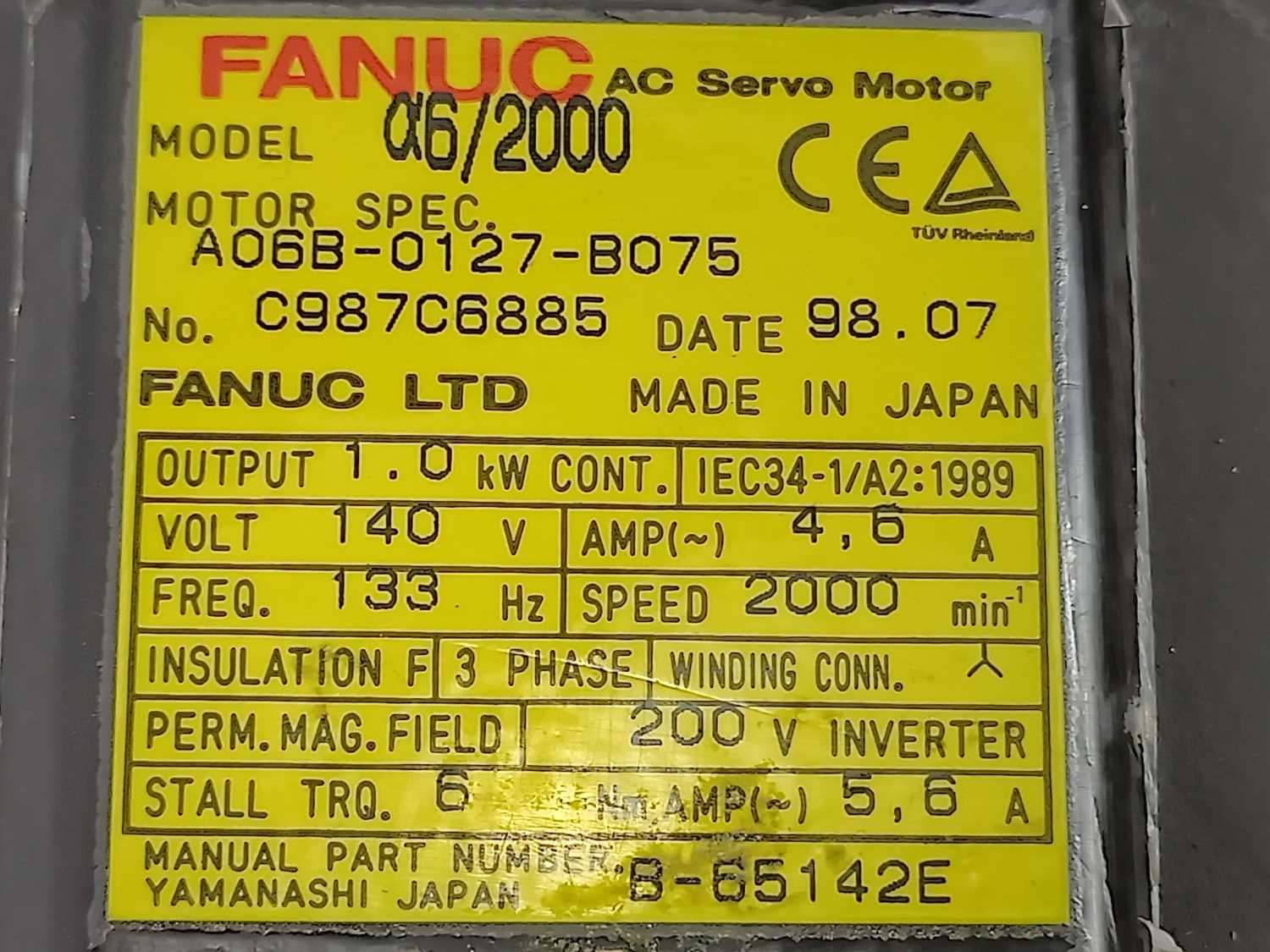 Fanuc A06B-0127-B075 AC Servo Motor a6/2000 1.0kW