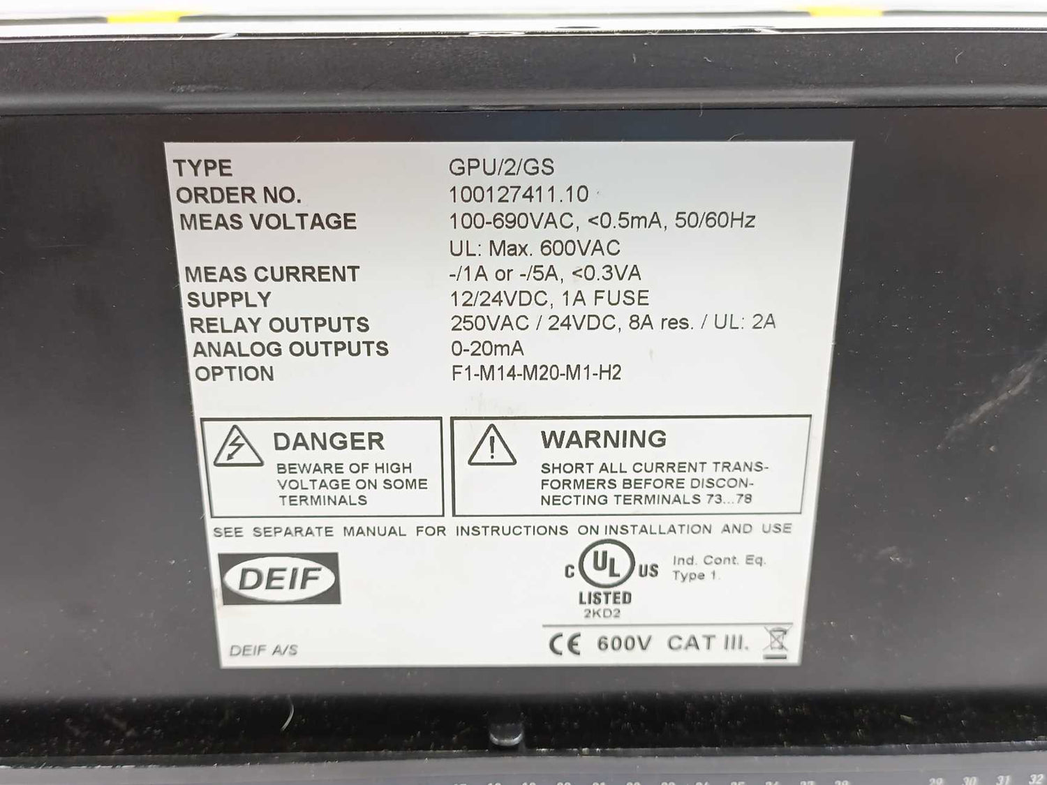 Has scratches. Has broken plastic. Refer to photos. Meas voltage: 100-690VAC, <0.5mA, 50/60Hz, UL: Max. 600VAC Meas current: -/1A or -/5A, <0.3VA Supply: 12/24VDC, 1A FUSE Relay outputs: 250VAC/24VDC, 8A res./UL: 2A Analog outputs: 0-20mA Option: F1-M14-M20-H2